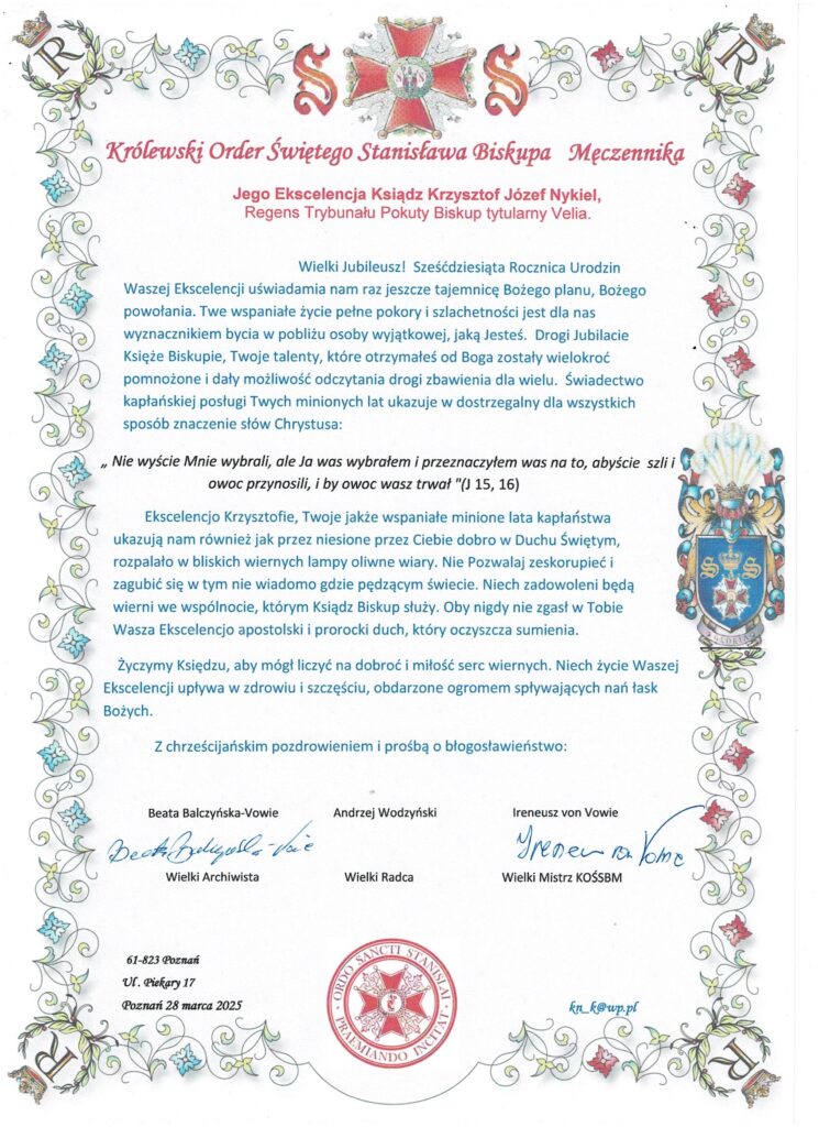 List gratulacyjny skierowany do naszego Przyjaciela